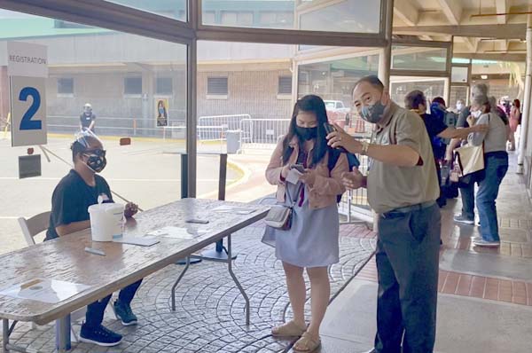 Maui County Finance Director Scott Teruya (correct) directs Los Angeles resident Josephine Lau in the midst of the beginning of the county’s publish-arrival screening methodology on Would possibly 4. The Maui Information / KEHAULANI CERIZO pics