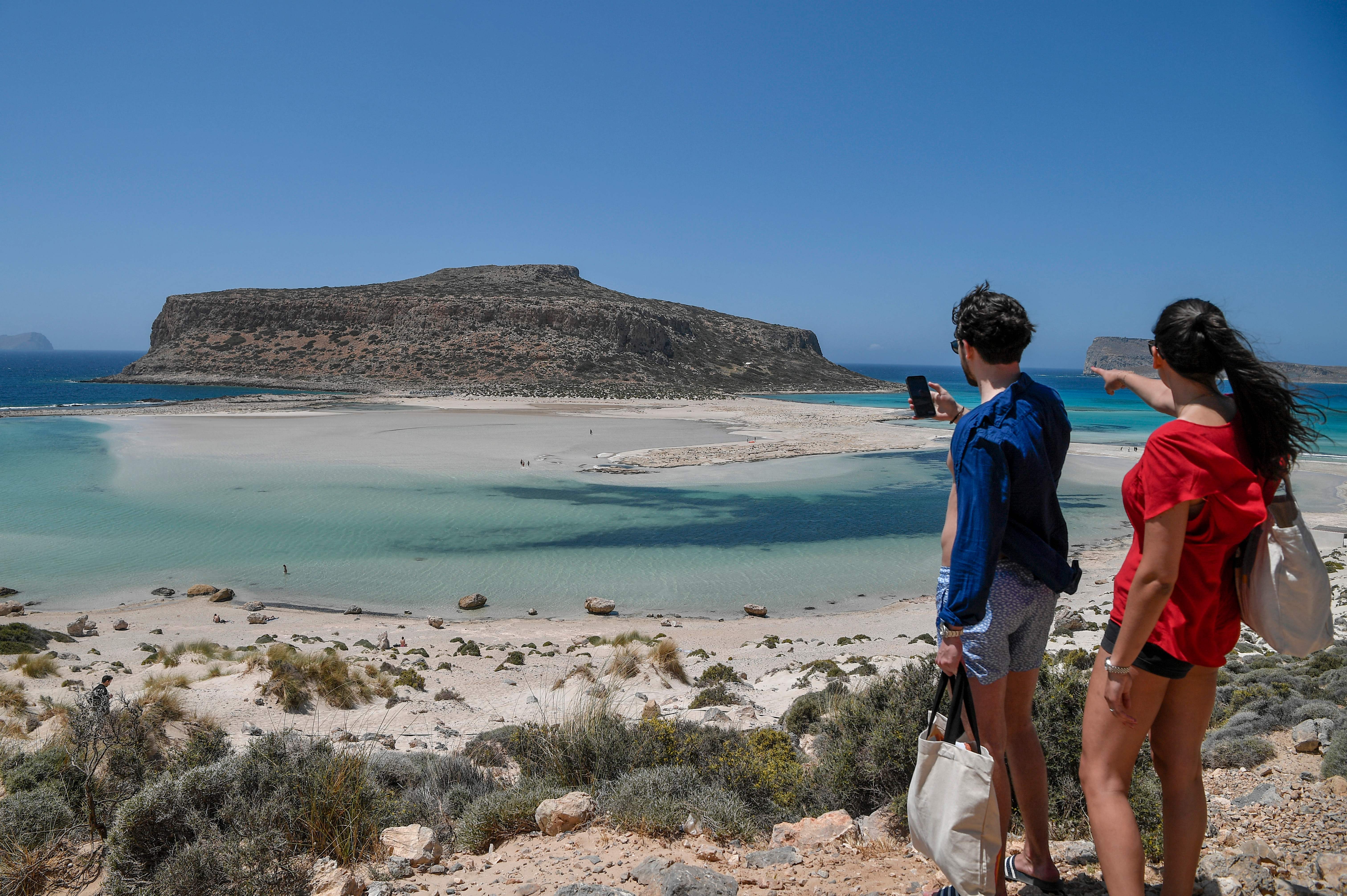 A pair of holidaymakers appears to be like on the Balos seashore entrance and its lagoon within the north west of the island of Crete, on Might 13, 2021.